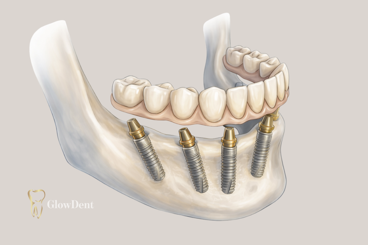 All-on-4 je savremena metoda kojom se kompletna bezuba vilica nadoknađuje pomoću četiri zubna implantata koji nose fiksni most. Implantati se ugrađuju u kost i služe kao stabilna osnova za trajne zube koji se ne skidaju.